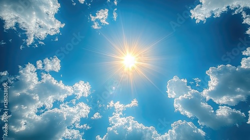 Bright sun shining in a clear blue sky with fluffy clouds, evoking a sense of tranquility and warmth