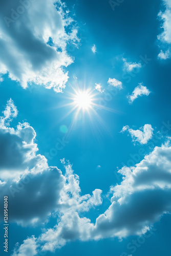 Bright sunny sky with soft, fluffy white clouds scattered across a vibrant blue background, with sun’s rays peeking through and subtle lens flare Generative AI