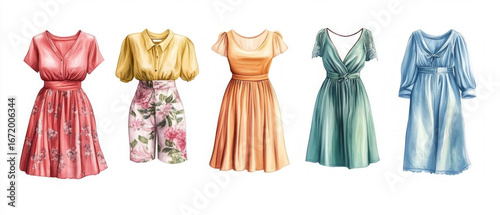 Bright vintage dresses on a white background, perfect for fashion catalogs and designer portfolios.