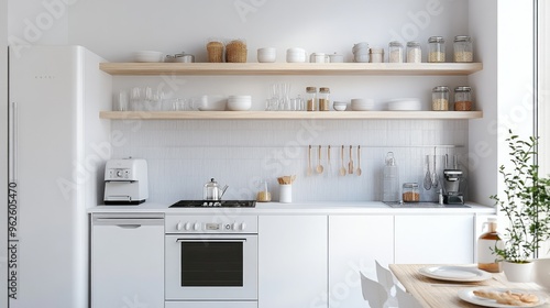 Bright white kitchen interior with open shelving, modern appliances, and a light backsplash for contrast.