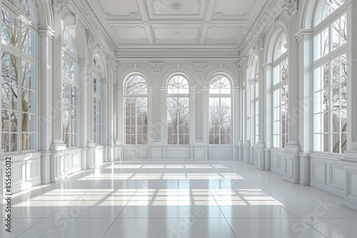 Bright white room with large windows and city view