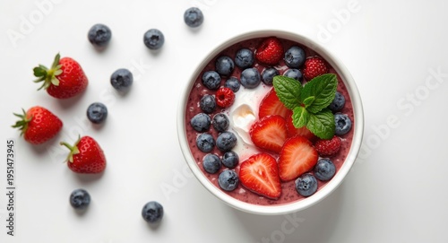 Bright white setting featuring a fresh acai berry bowl with leafy garnish from above