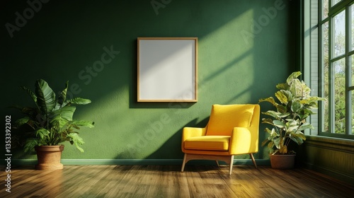 interior, design, room, armchair, yellow, wall, green, plant, pot, art, frame, sunlight, window, wood, floor, modern, light, shadow, furniture, home, decor, indoor, nobody, empty, blank, space, potted, houseplant, minimal, cosy, comfortable, lounge, stylish, bright, contemporary, decoration, elegant, living, nature, wooden, texture, surface, indoor, simple, botanical, apartment, illustration, mock