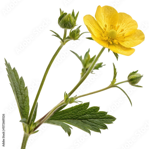 Bright yellow buttercup flower isolated on a white background showcasing its delicate petals and foliage