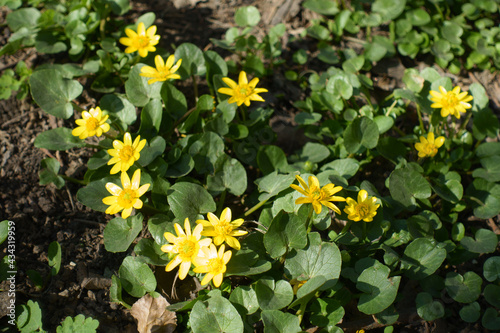 Bright yellow flowers of ficaria verna in March