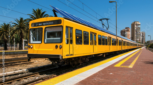 train, solar, yellow, station, palm, transportation, public, energy, modern, travel, railway, urban, technology, infrastructure, commuter, city, design, functionality, environment, landscape, sunny, platform, vehicle, electric, rail, system, innovation, sustainable, transport, architecture, bright, scenic, public transport, green, city landscape, railroad station, solar energy, public transportation