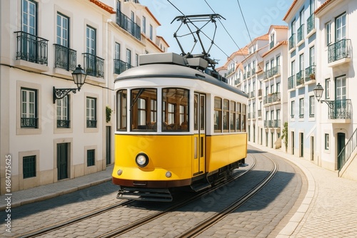 tram, streetcar, transportation, travel, background, light, concept, vintage, retro, classic, urban, city, architecture, cobbled, daylight, yellow, bright, europa, tour tourism, street, nostalgic, building, rail, scenic, exterior, public, historic, journey, culture, sunny, traditional, picturesque, elegant, heritage, facades, track, electric, charming, destination, vacation, atmosphere, window, summer, route, sightseeing, stylish, ai, generative, illustration