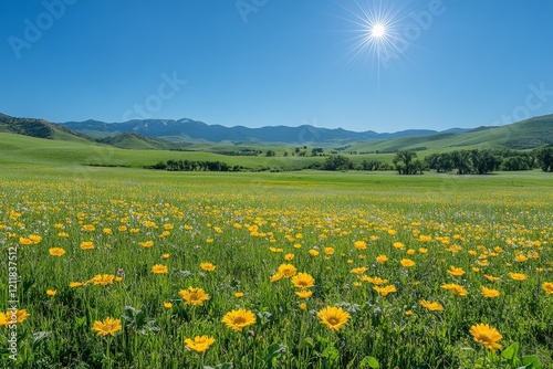 Bright yellow wildflowers bloom in a sunlit meadow against a backdrop of mountains during midday