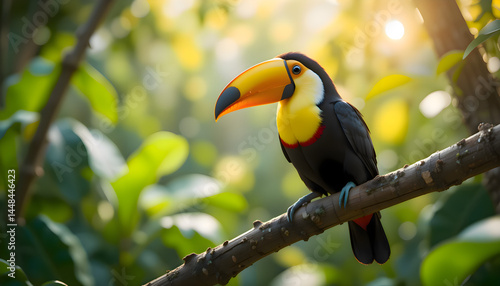 Brightly colored bird perched on a tree branch in a lush jungle environment