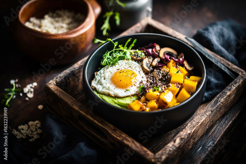 Brightly colored breakfast bowl showcases fresh mango, greens, and a perfectly cooked egg, paired with a warm grain dish, creating a comforting morning meal on a wooden tray