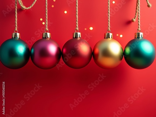Brightly colored Christmas ornaments hanging from twine against a festive red background during the holiday season