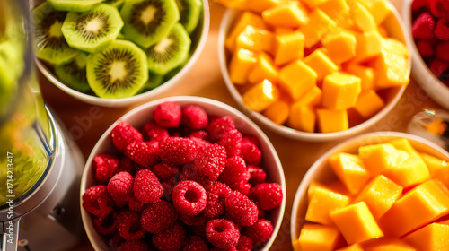 Brightly sliced mango, kiwi and raspberry for fresh summer dessert