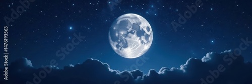 Brilliant full moon dominates a velvet night sky, countless stars twinkle , dark blue, full moon