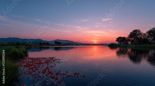 sunset, water, field, landscape, nature, calm, serene, vibrant, flora, pink, purple, sky, tranquil, explore, peaceful, scenery, bright, colourful, beautiful, environment, summer, evening, dusk, sunlight, horizon, lake, stillness, view, fresh, scenic