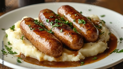 British bangers and mash with sausages and mashed potatoes on a white plate.