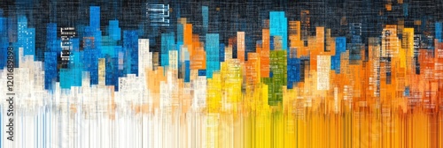 Broken Binary Cityscape - Abstract cityscape representing data vulnerability, digital risk, system failure, code corruption, and security breach. A vibrant, modern depiction.