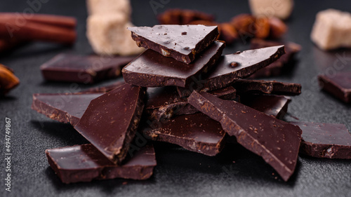 Broken black chocolate pieces with star anise and cinnamon