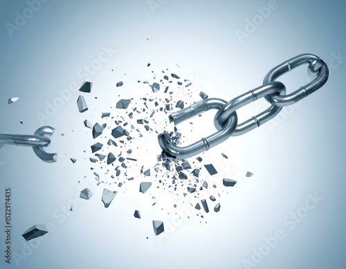 Broken chain link exploding into pieces, isolated on a light blue background. Concept of freedom, overcoming challenges, breaking free.