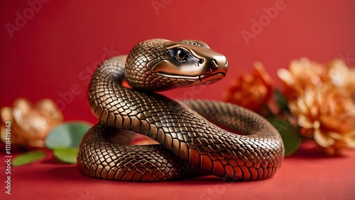 Bronze snake figurine on a red background. The symbol of 2025. Happy Chinese New Year.