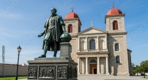 statue, bronze, man, historical, attire, globe, church, architecture, stone, building, dome, red, religious, landmark, public, art, sculpture, daylight, blue, sky, facades, column, entrance, figure, historical building, city landscape, europa, travel, tour tourism