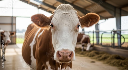Brown and white dairy cow in sunlit barn with curiosity