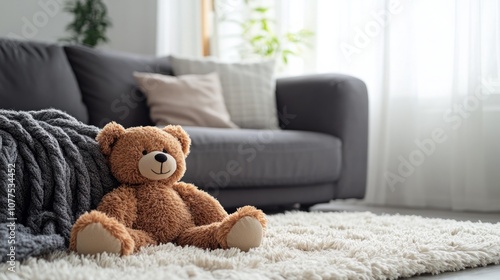 Brown bear toy resting on a fluffy rug in a living room generative ai