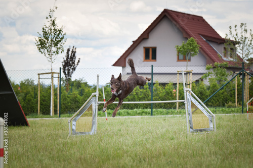 brown border collie is jumping over the hurdles. Amazing day on czech agility privat training