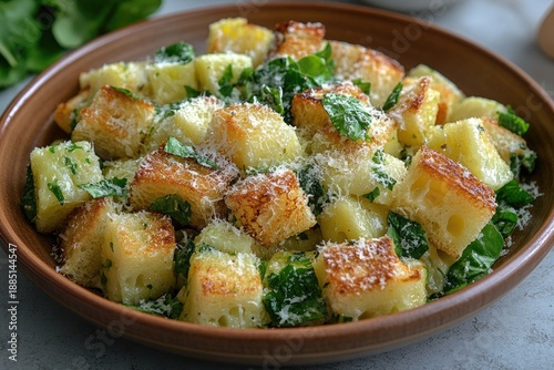 Brown bowl with golden croutons, spinach, and cheese, fresh tasty salad. Use this image for recipes, cooking blogs, or food advertisement projects.