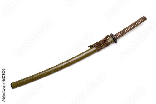 Brown handle Japanese sword and green scabbard on white background