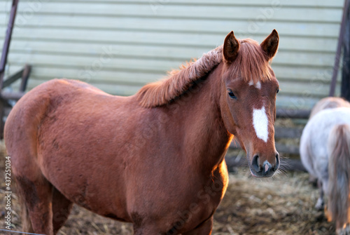 Brown horse and white pony in the stable close-up in a sunny day in Estonia