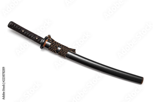 Brown leather cord tie on grip Japanese sword and black scabbard with steel fitting isolated in white background.