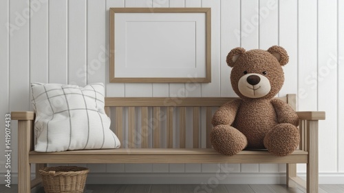 teddy, bear, bench, wood, wooden, indoor, plush, toy, stuffed, animal, cute, fluffy, soft, cushion, pillow, basket, frame, blank, white, wall, stripes, light, neutral, beige, brown, playroom, childcare center, decor, decoration, home, cosy, comfortable, seat, furniture, design, minimalist, simple, grid, pattern, fabric, textile, shadow, render, studio, nobody, background, space
