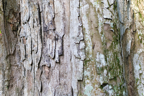 Brown textured tree bark with green moss in the forest