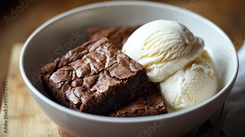 Brownie with a soft center and crunchy edges, served with vanilla ice cream in a bowl generative ai