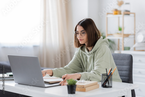 Brunette freelancer using laptop near notebooks and books at home.