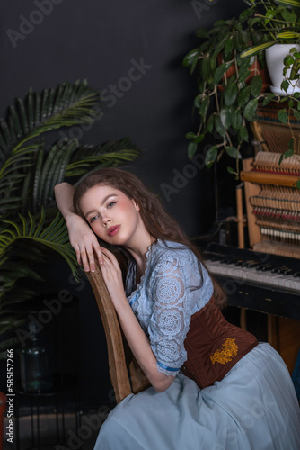 Brunette girl in a blue dress sits on a vintage chair