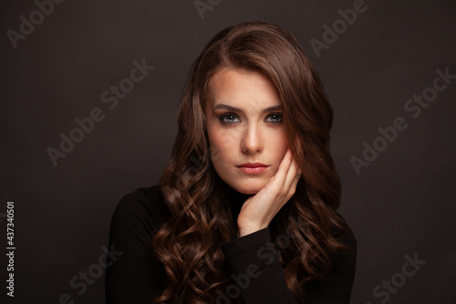 Brunette girl with long and shiny wavy hair . Beautiful model with curly hairstyle on dark background .