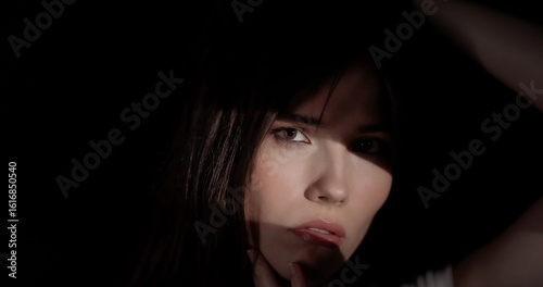 woman, model, fashion, beauty, portrait, dark, shadow, posing, face, eye, brunette, coiffure, make-up, glamour, mysterious, sensual, elegant, studio shot, indoor, looking, expression, hand, touching, one person, young adult, caucasian, female, 20s, hair, lip, skin, contemporary, artistic, photo, low key, chiaroscuro