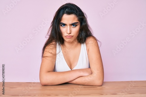 Brunette teenager girl wearing casual clothes sitting on the table skeptic and nervous, disapproving expression on face with crossed arms. negative person.