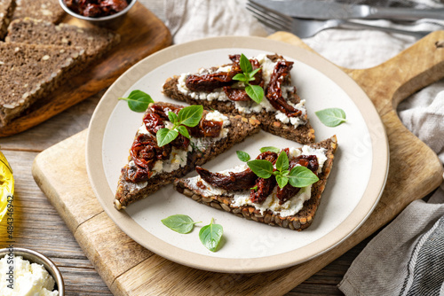 Bruschetta or wholegrain bread sandwich with cream cheese and sun-dried tomatoes. Crostini in a plate on a kitchen table