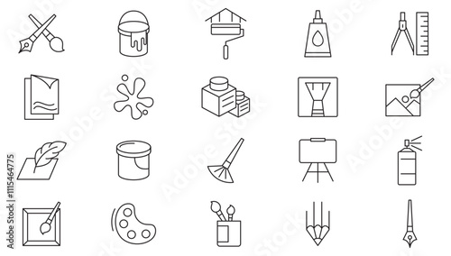 Brush and Painting line icon set. Painting tools, paint, art, canvas, spray, color palette, paint bucket, highlighter, sketchbook, notebook line icon set. Ui thin line icon pack.