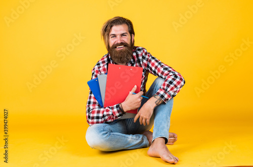 brutal bearded man wear checkered shirt having lush beard and moustache holding folder with documents, paper work