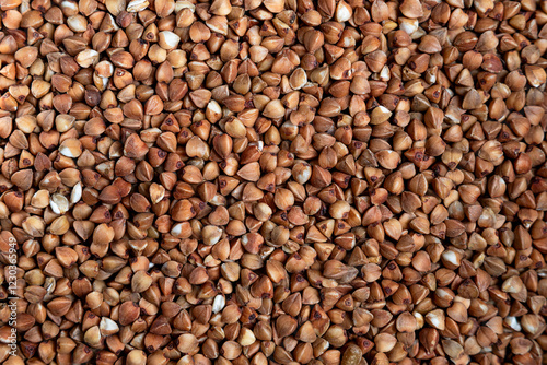 Buckwheat Close-up. Buckwheat grains, brown in color with a variety of shades and textures. Buckwheat looks natural and appetizing.