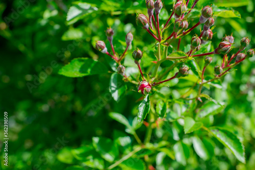 Bud of red rose in a garden on a sunny day