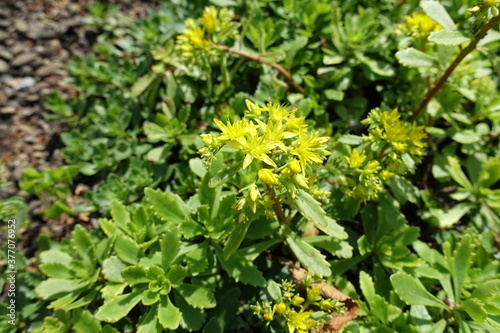 Buds and bright yellow flowers of Sedum kamtschaticum in May