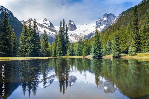 Bugaboo Granite Spires and Surrounding Glacier, with Reflection in Lake Below: Canada Rocky Mountains