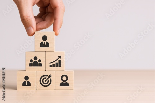 Building Business Success: Hand Placing Wooden Block with Icon on Pyramid Structure
