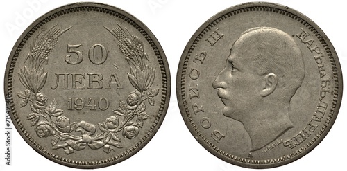Bulgaria Bulgarian silver coin 50 fifty leva 1940, face value and date surrounded by plant composition, head of Tzar Boris III left,