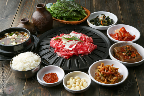 Bulgogi Table with Korean Traditional Food 한국전통 음식 한상차림의 불고기 한 상 테이블