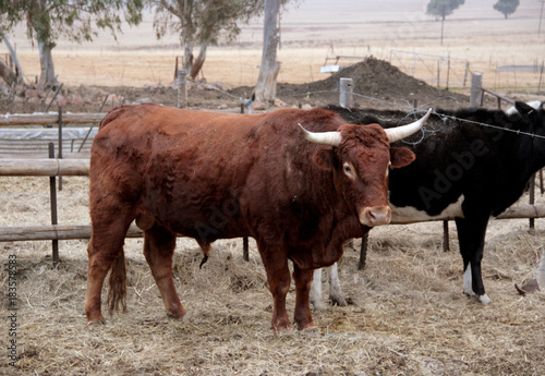 Bull, cow in the pen, pet. Agriculture, farm